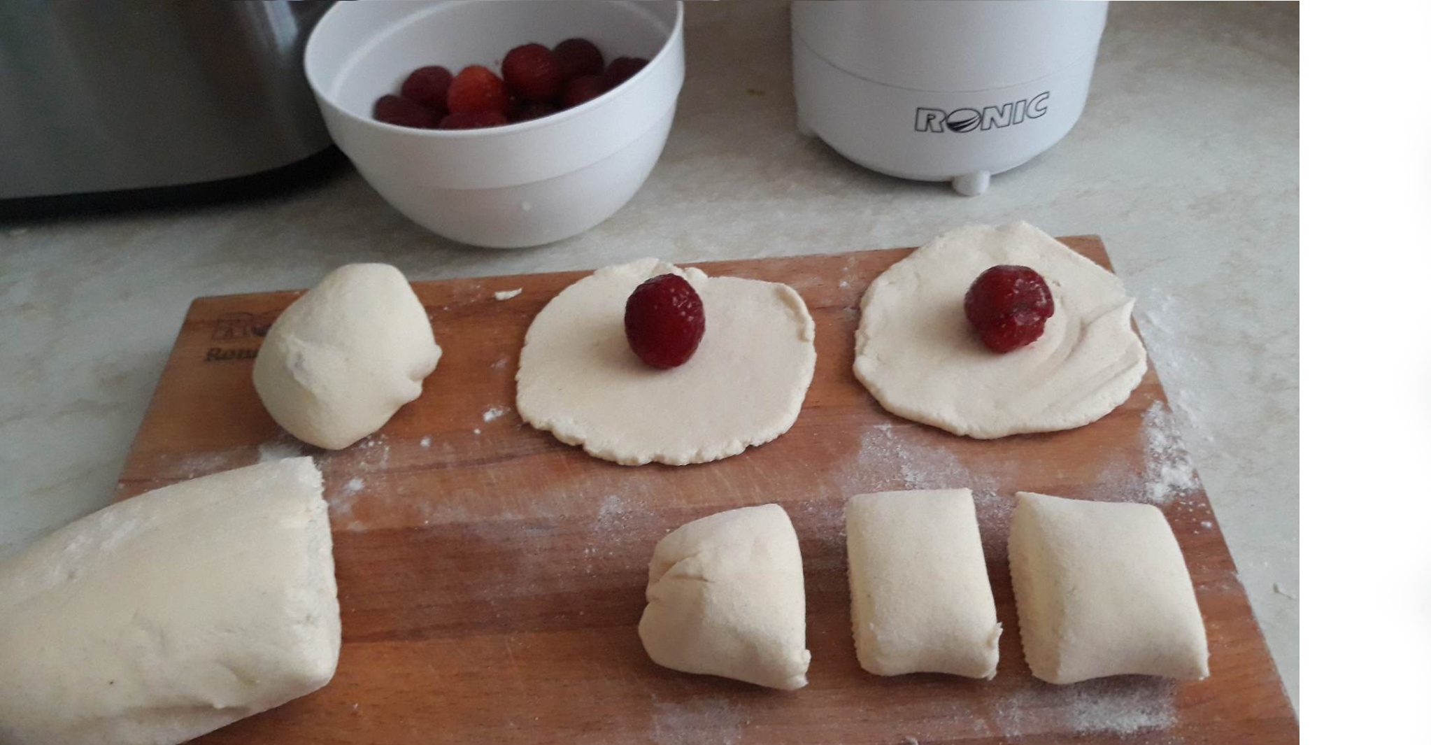 Těsto rozdělíme na 12 kousků a do každého zabalíme jahodu.
